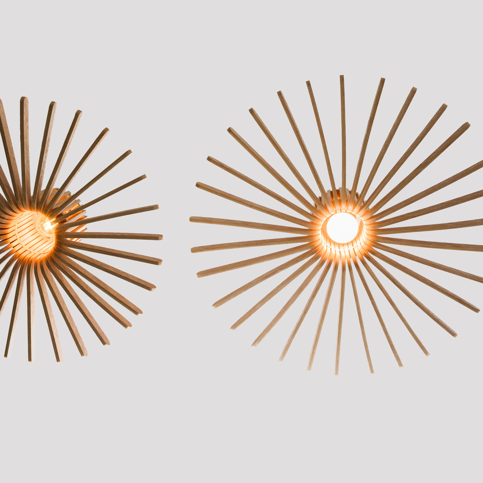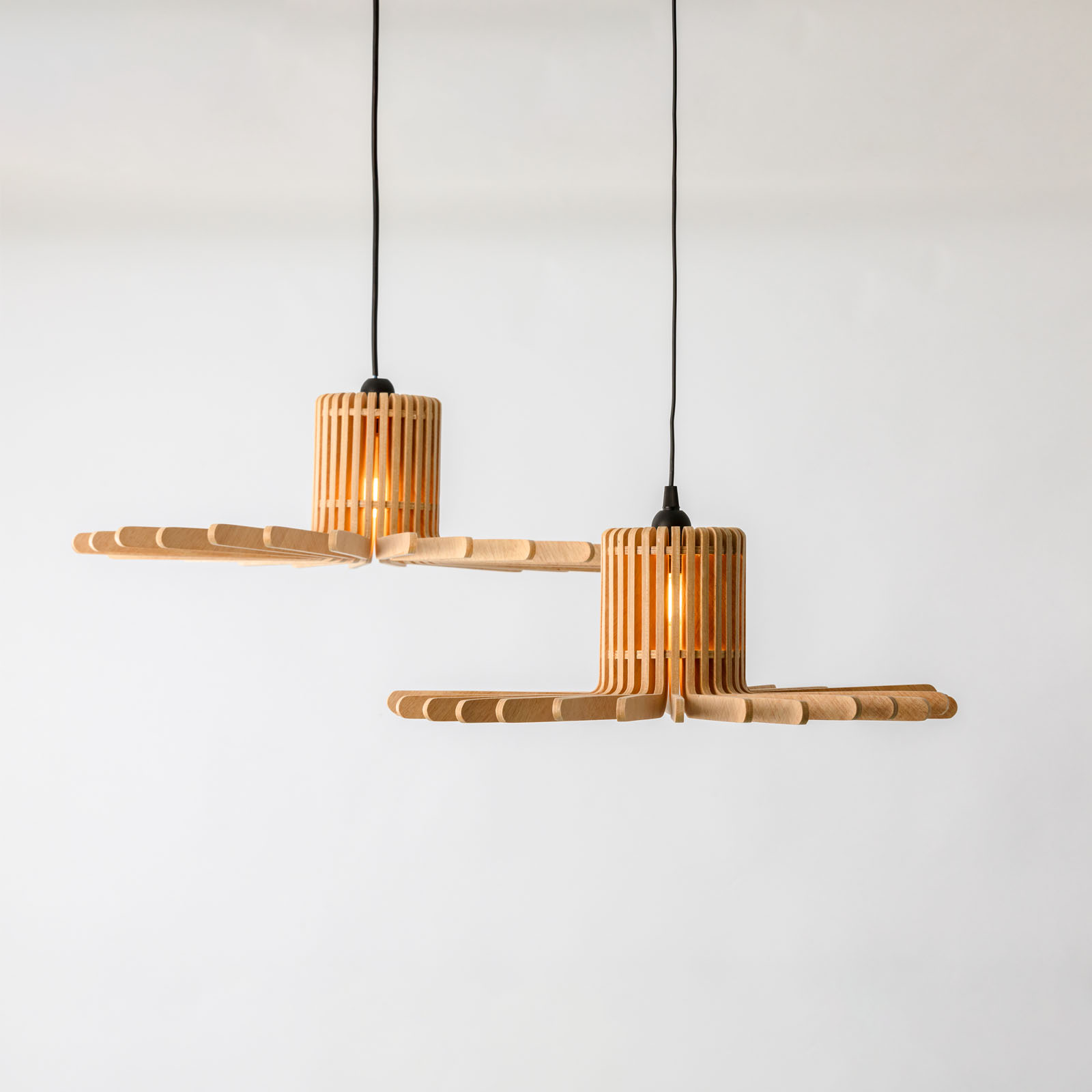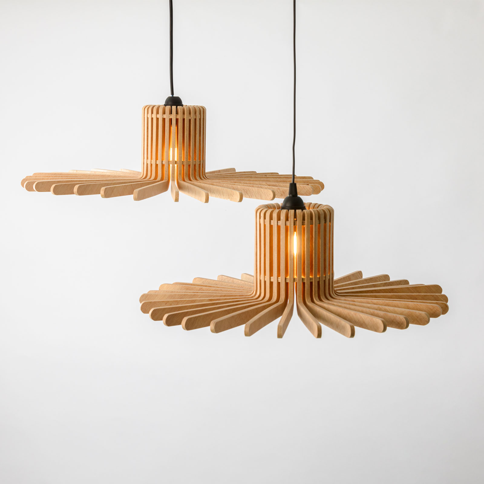 Cette série de deux suspensions d’intérieur a été conçue pour offrir une lumière douce et tamisée, parfaitement adaptée aux espaces de vie tels que le salon, la salle à manger ou la chambre.